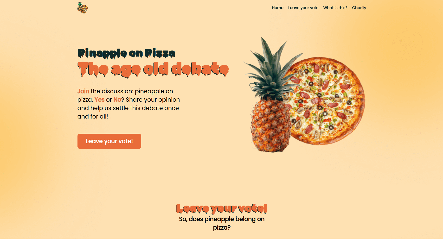 A voting platform for people to decide if pineapple belongs on pizza. As of Dec 8 2024, majority votes are "yes" for pineapple.